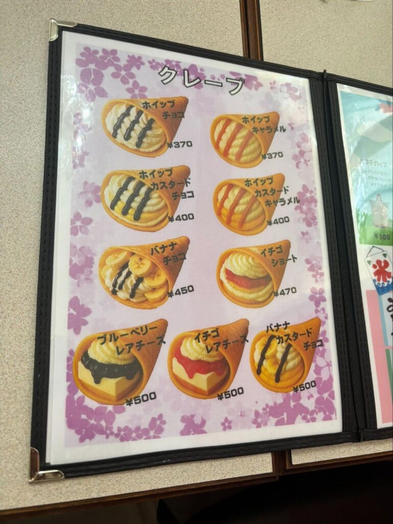 そしてこちらがクレープのメニューです。シンプルなホイップチョコ&キャラメルのようなシンプルなものから、レアチーズが入った豪華版までありますが、お店の人の話ではバナナチョコがいちばん人気とのこと。