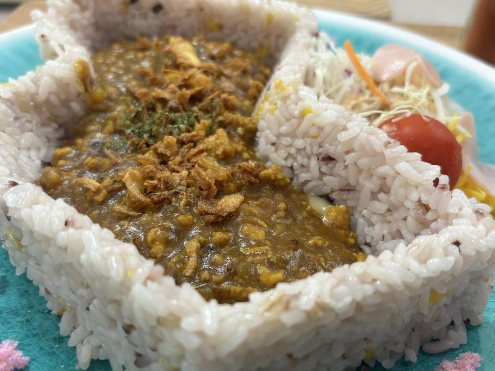 桜さんのダムカレーは、こころキーマ(1200円、税込、以下同じ)です。キーマのダムカレーは、地元の専門店の協力を得ながら、スパイスが香りながらも辛すぎない風味に仕上げました。