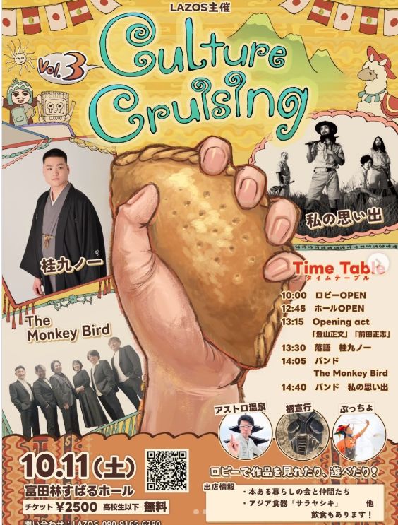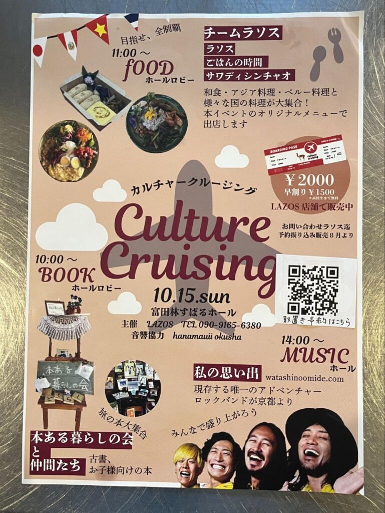 そういう皆さんに朗報です。10月15日日曜日にすばるホールでカルチャークルージングというイベントが開催されます。ということでチラシを入手しましたが、いまいちどのようなイベントなのかピンときません。そこで主催者であるペルー料理のラソスさんにお話を伺いました。