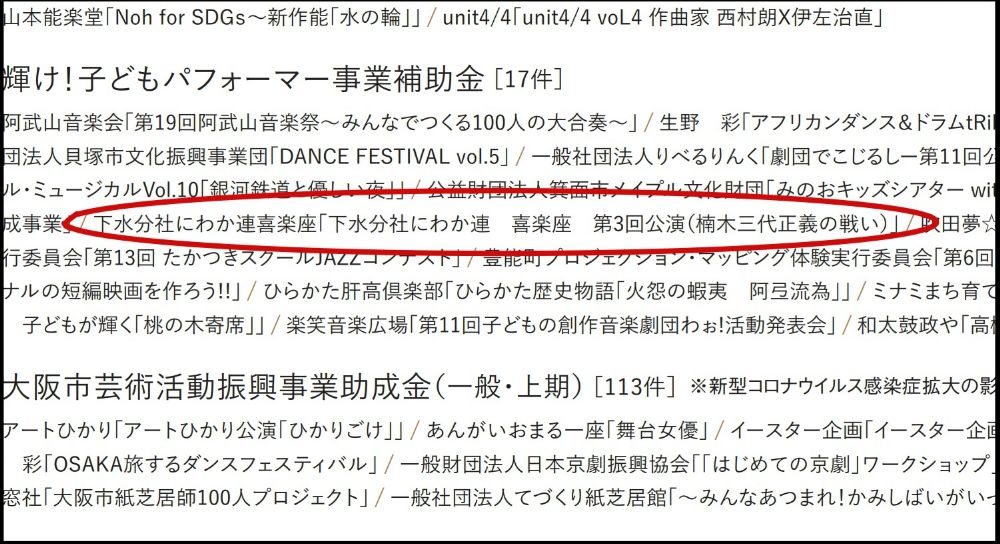 とはいえ4月に行われた下水分社喜楽座にわか公演のように、個人で行ったとしても、郷土芸能の復活という内容が評価され、大阪府芸術文化振興補助金のようなものがあればそれも可能でしょう。