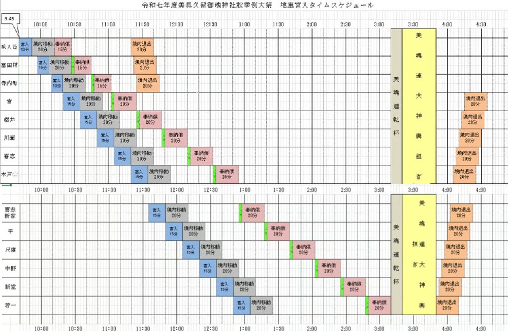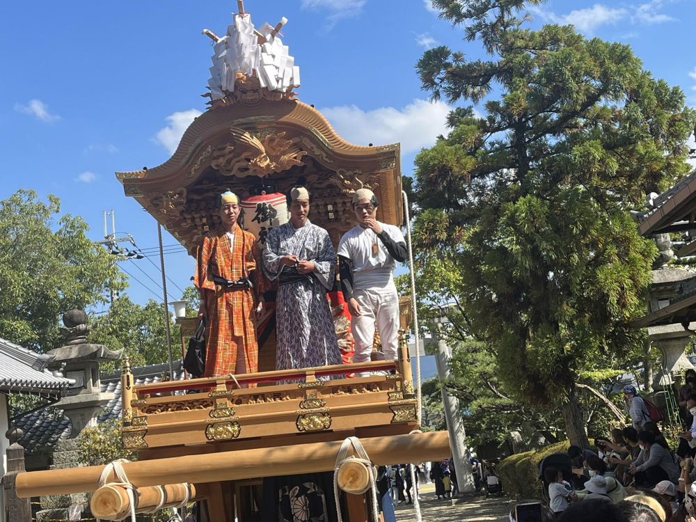 美具久留御魂神社のトップページ(外部リンク)に各地車の宮入の時間と俄の奉納の時間が紹介されていました。これによると順番に宮入りをして場所を移動してから順番に俄が奉納される見込み。朝から見学すれば最大14もの俄が見られることになっています。お時間があれば河内の伝統的な俄を神社参拝とセットで鑑賞してみてはいかがでしょう