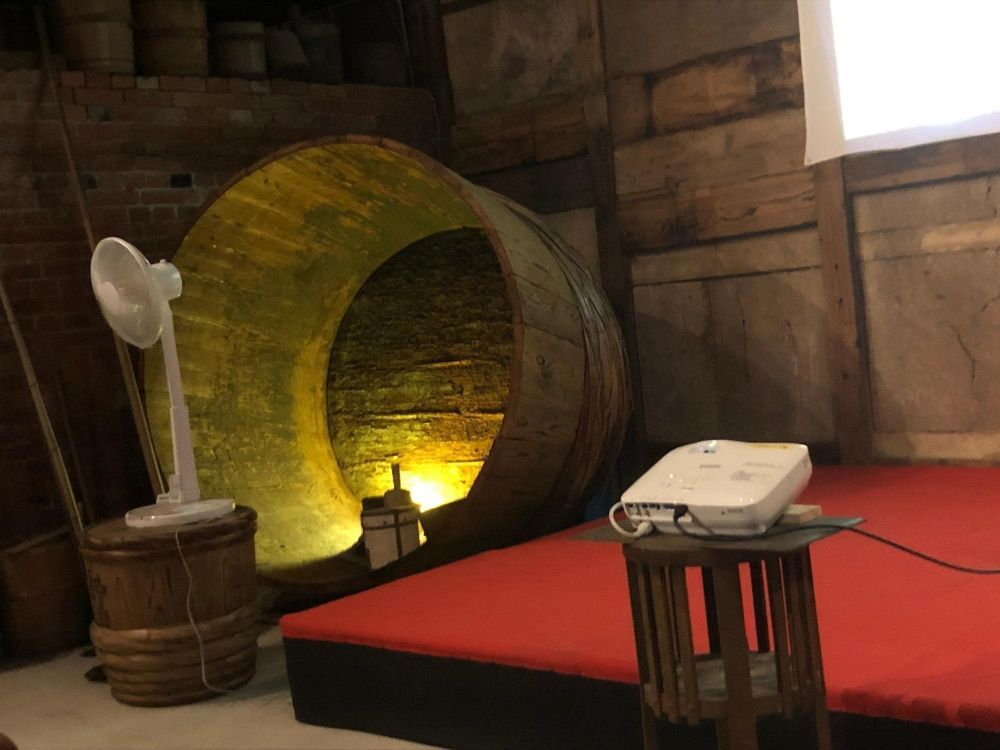 当時の醤油づくりで使っていた大きな樽は、今はディスプレイなどで使っています。