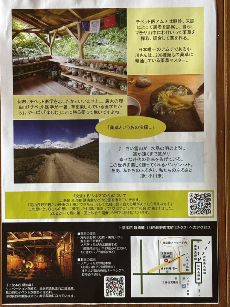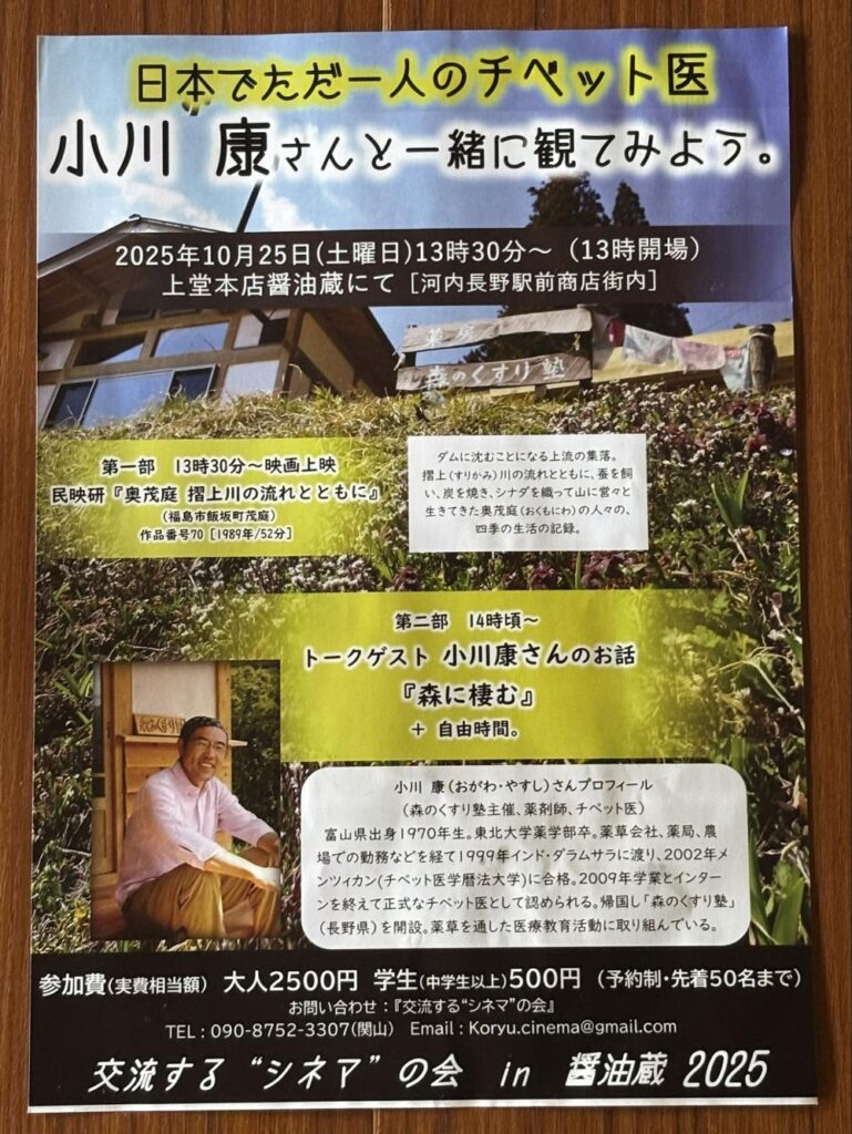 さらに1週間後、こちらも非常にレアなイベントが行われます。驚いたことに日本で唯一のチベット医といわれる小川康さんが河内長野、上堂醤油蔵に来られます。
