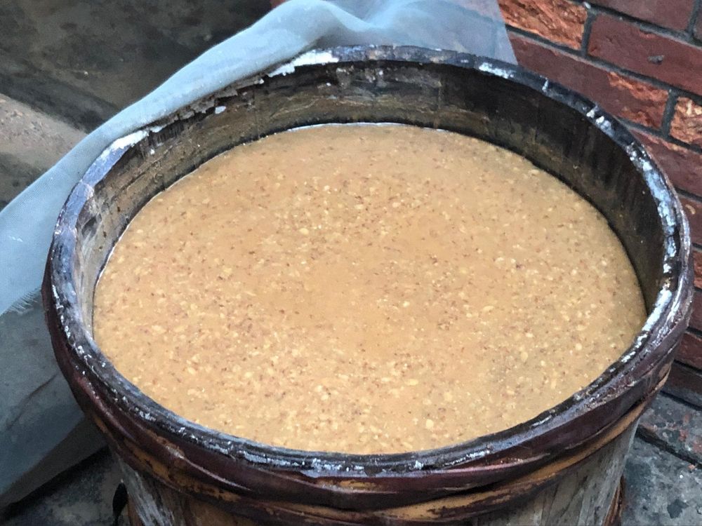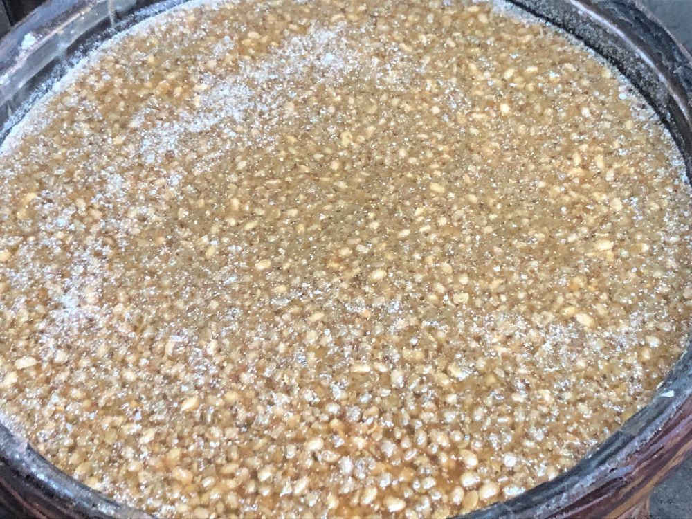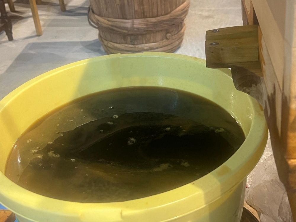 できた麹に塩水を加えて発酵・熟成させてもろみを作ります。そしてもろみを搾ると醤油ができるそうです。