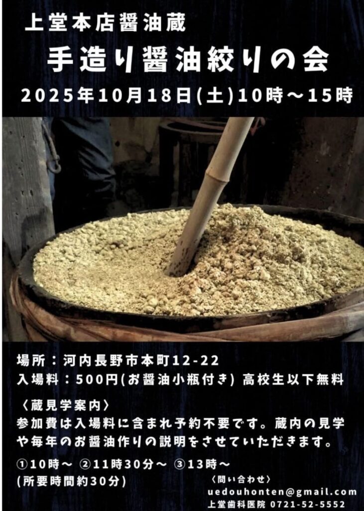 次の土曜日18日に3回行われます。イベント用の小規模とはいえ、上堂醤油蔵本来の目的だった醤油作りで、かつ河内長野産の醤油になります。興味のある方は、イベントに参加してみてはいかがでしょう。