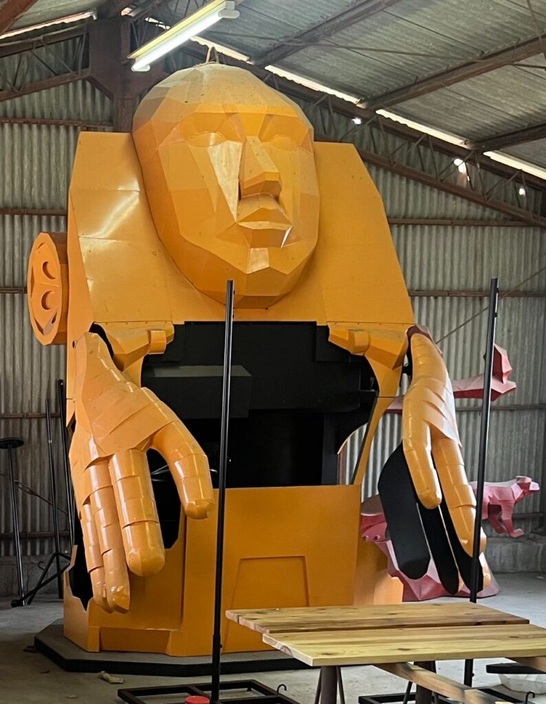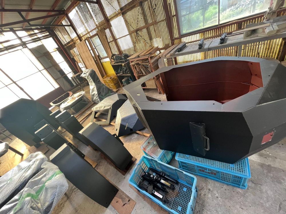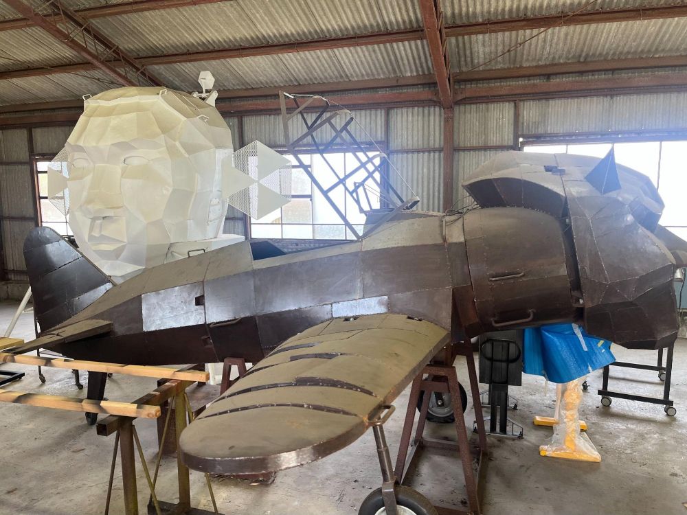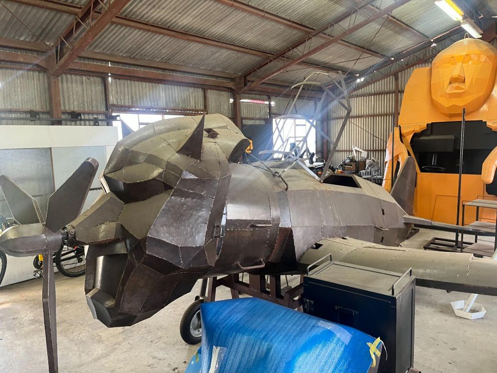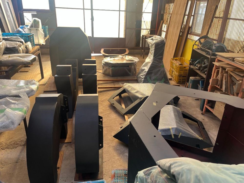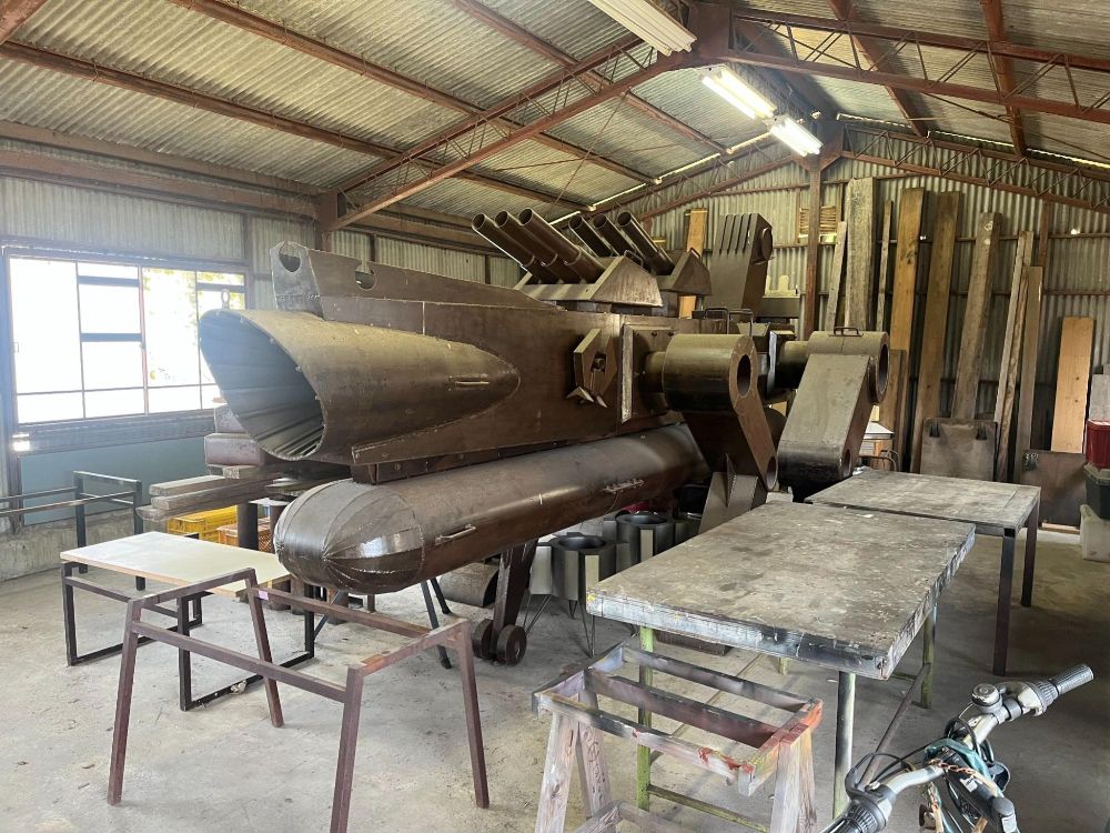 完成したフライングギドラを最後に見せていただきました。といっても分解した状態でした。鉄は重いので、分解した状態で会場に運んで組み立てるそうです。