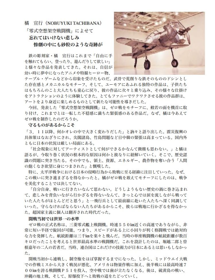 また日本繊維新聞社の記者である八木健一氏が、橘さんの展覧会でのレビューを書いたコラム記事があり、そこで零式空想架空戦闘機について詳しく書かれています。前半は上の画像ですが、後半には橘さんのご家族と米兵とのかかわりについて事も記載されていました。