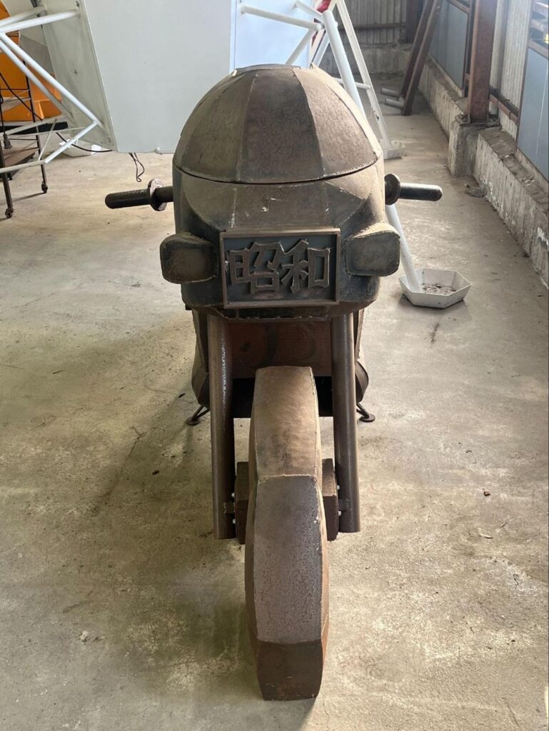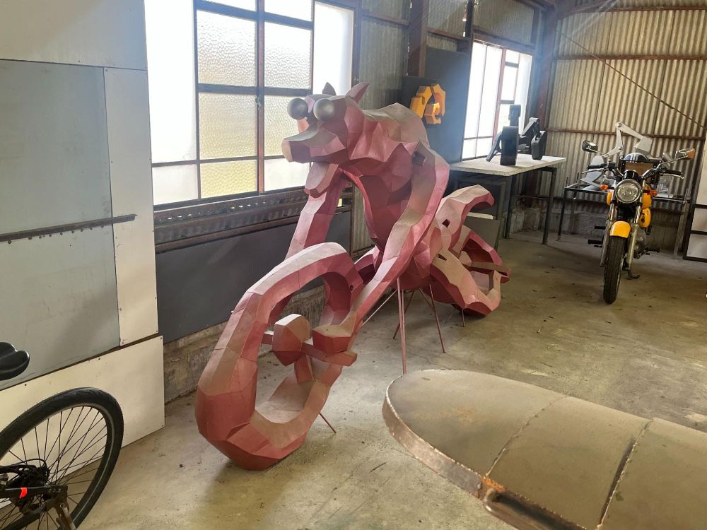 その他にも、このアトリエにはいろんな作品が置いてあります。例えばこちらはバイクをモチーフにしています。「ピンクドッグ」という作品名で岡山県の犬島で展示したものです。