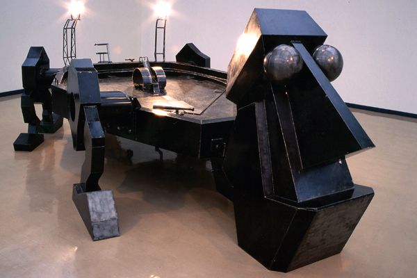 こちらです。顔がついた乗り物が多いですね。このような個性あふれる作品が作れたのは、同じ時代のアーティスト、ヤノベケンジさんの作品を見て感じたことがあったから。