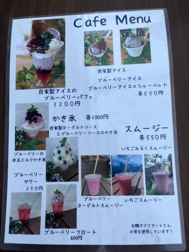 さっそくカフェメニューを拝見。まーるいかんぱにーさんは、ブルーベリー狩りも行っていますが、カフェだけの利用とブルーベリーの直売利用だけも可能です。