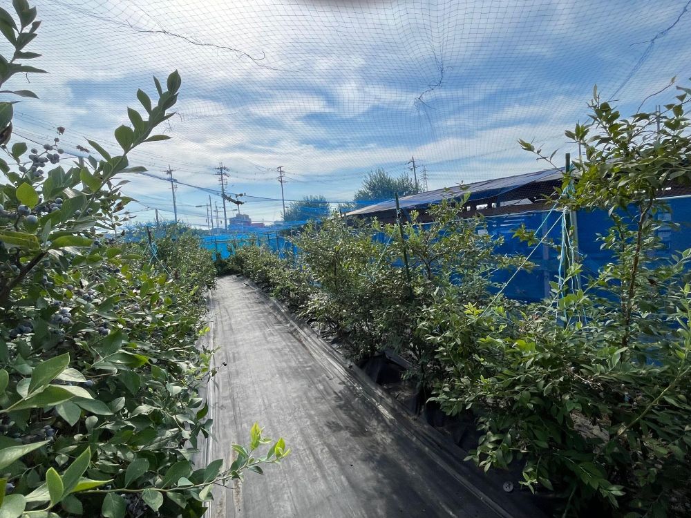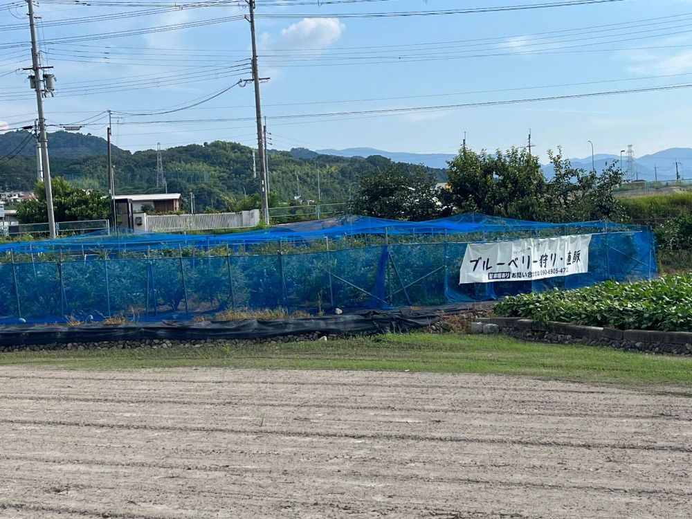 石川を越えると、さっそく見えてきました。この青いネットの中にブルーベリー畑があります。