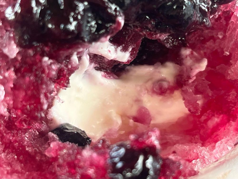 実際にそれは食べてみて正解だと思いました。隠し味というか食べながら味わえるヨーグルトの風味、ブルーベリーと氷の三拍子そろった調和のとれた絶妙な味わい、そして体が一気に涼しくなりました。