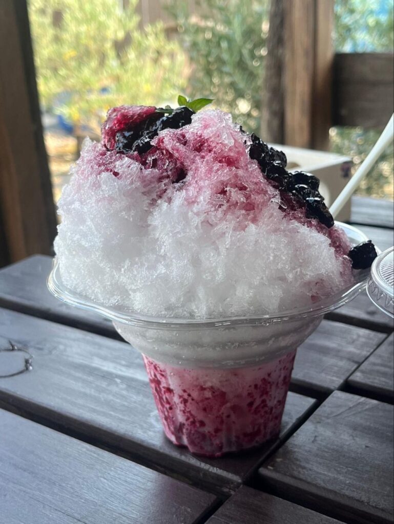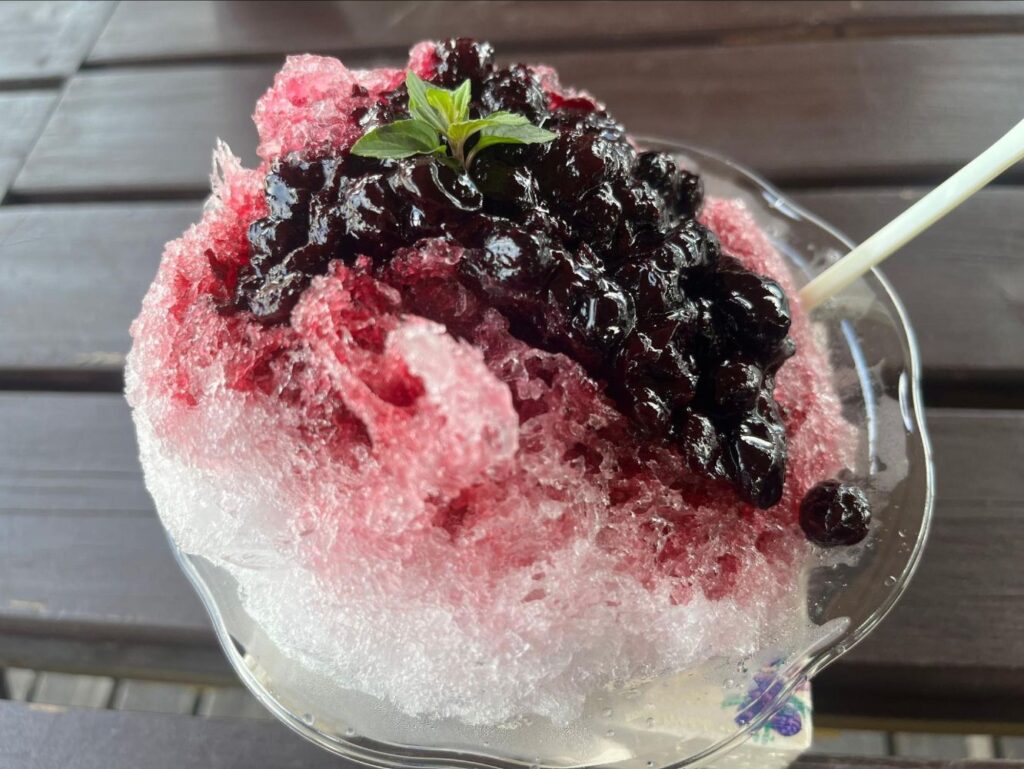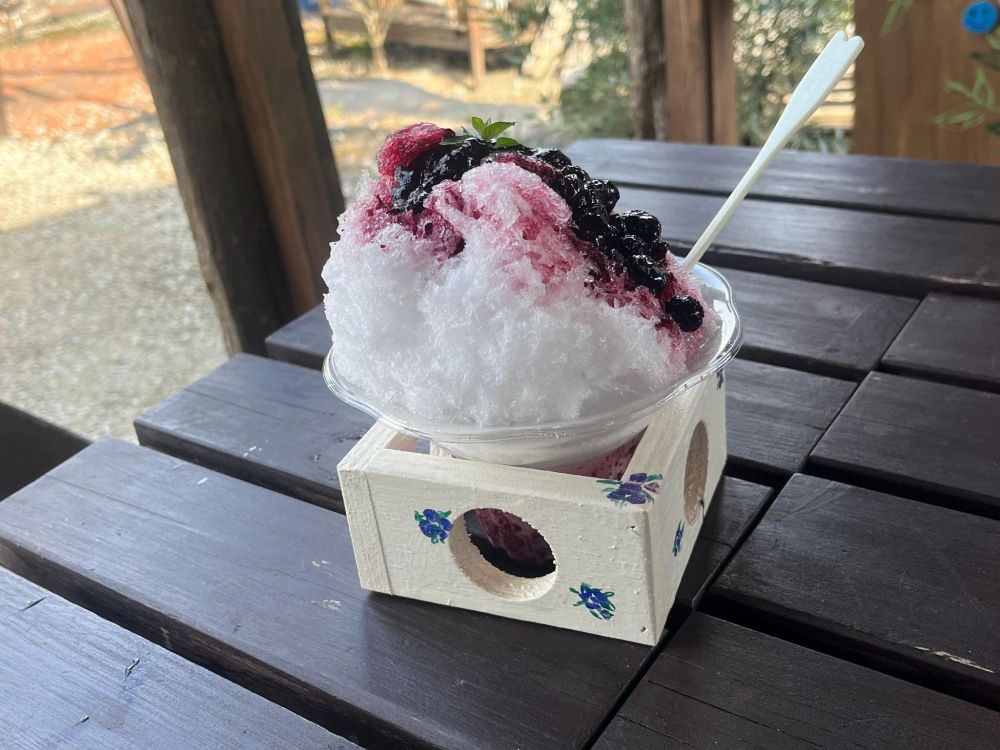 改めて上から見ましょう。かき氷にかけられたブルーベリーソースの上に載っている、ブドウのようにも見えるこのぶつぶつはすべてブルーベリーづくし!ブルーベリー畑の前だからこそできる贅沢ですね。