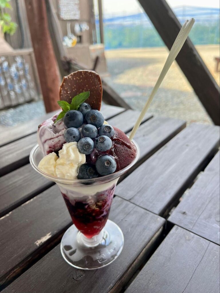 つぎに、こちらは自家製アイスのブルーベリーパフェ(1200円)。金額だけ見ると割高に感じるかもしれません。しかし中に入っている物を聞くと納得の料金です。それはパフェの底から上にかけて、次のスイーツが入っているからです。