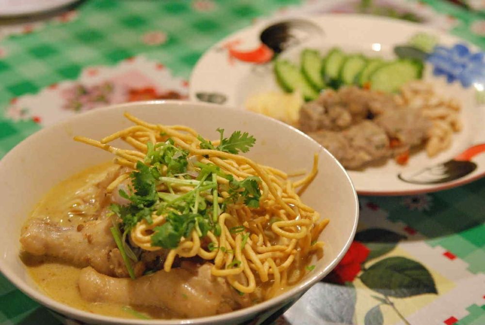 カオソーイはスパイシーなカレースープで小麦麺の揚げたもの茹でたものの2種類入った独特のスタイル。タイの北の古都チェンマイの代表的料理です。カレーに使うレッドカレーペーストも、生ハーブやスパイスを皆さんで叩いて自家製で作りますよ!どんなものを使って市販のレッドカレーペーストが作られているかを知るのも料理教室ならでは。