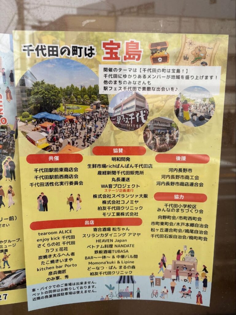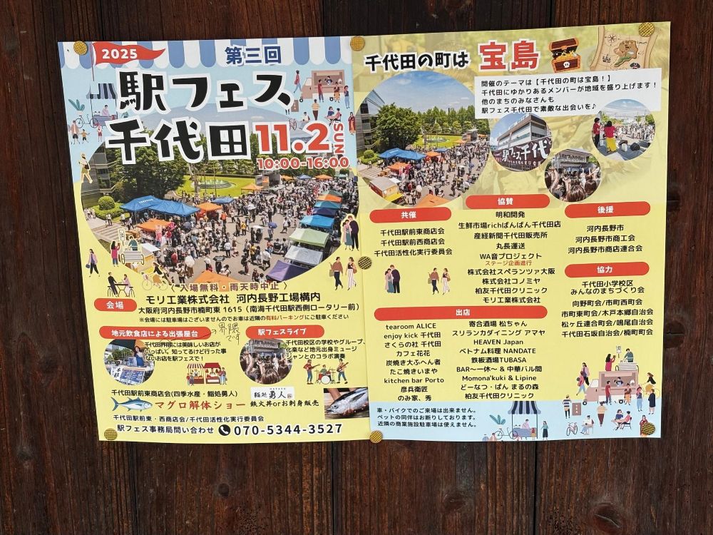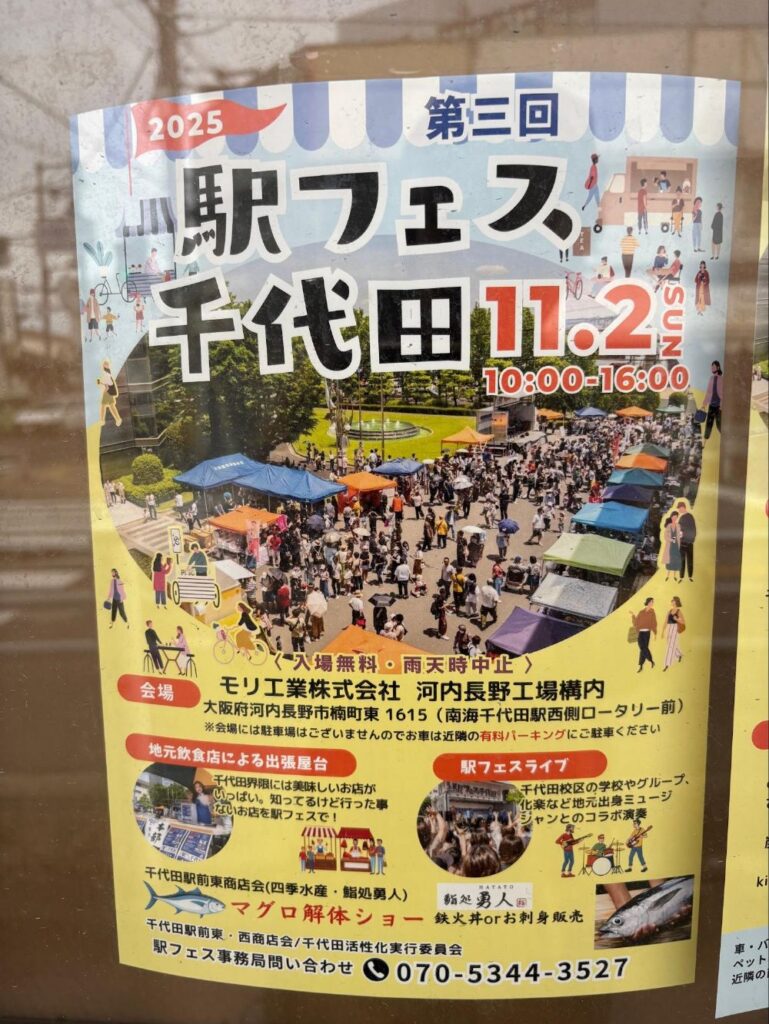 同じように河内長野でも万博の影響と思われる理由で、しばらく実施されなかったイベントがありました。それが南海千代田駅前のモリ工業さんの敷地で行われていた駅フェス千代田です。しかし、2年半ぶりに復活!11月2日の開催が決まりました。