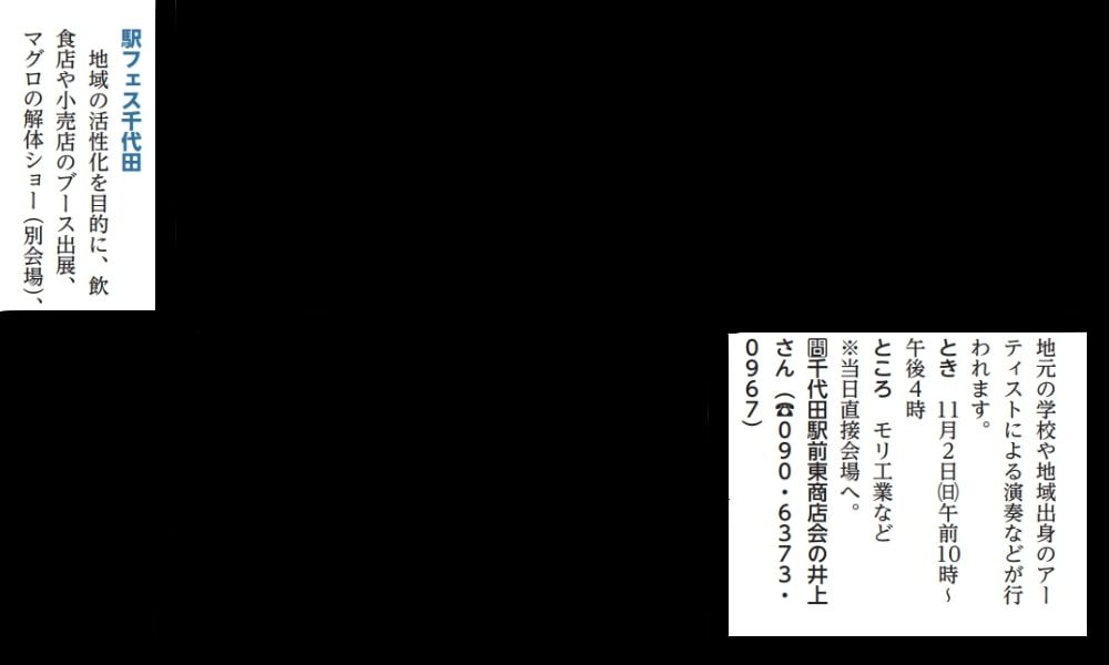 さらに広報誌によれば別会場とのことですが、千代田駅前東商店会(四季水産・鮨処勇人)さんによるマグロ解体ショーがあります。そして鉄火丼又はお刺身販売が行われるとのこと。前回にはない斬新な企画ですね。