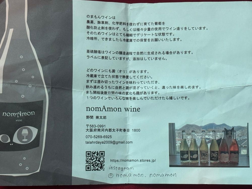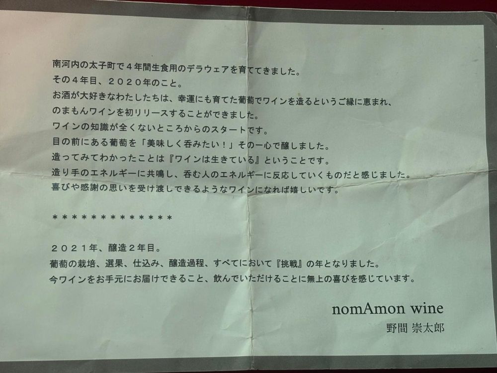 農薬、除草剤、化学肥料を使わわないぶどうで造るワインは、酸化防止剤も使わないデリケートなものです。だからでしょうか?「ワインは生きている」と実感できたとのこと。そのため冷蔵庫などの冷暗所での保管が必須なこと、中身にオリが入っているのが特徴です。ワインの名前は、夫妻の苗字「野間」から「nomAmon wine」というブランドとしました。