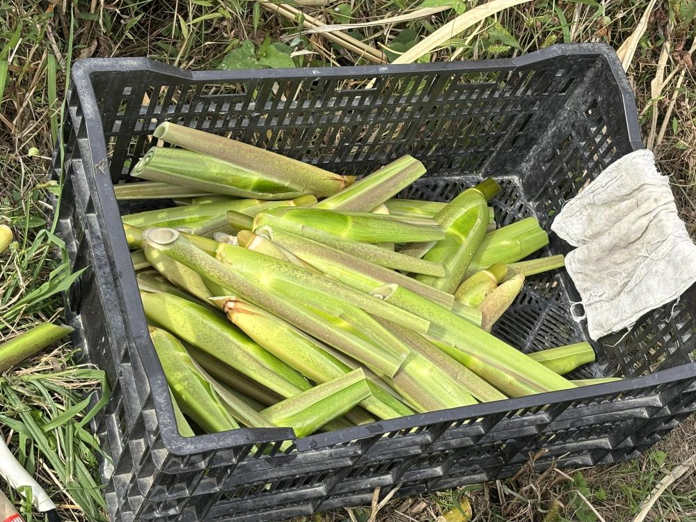 ぶどうと比べるとマコモは非常に栽培しやすいそうで、田植えの頃に植えると放置しても育つそうです。唯一気にすべきことは水の量で、畑に水がなくなるとマコモがダメになります。だから野間さんは定期的に水の量をチェックし、収穫を待つだけだと言います。