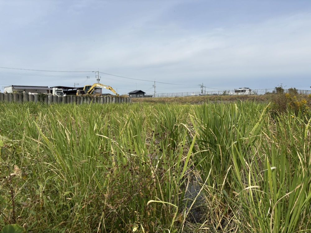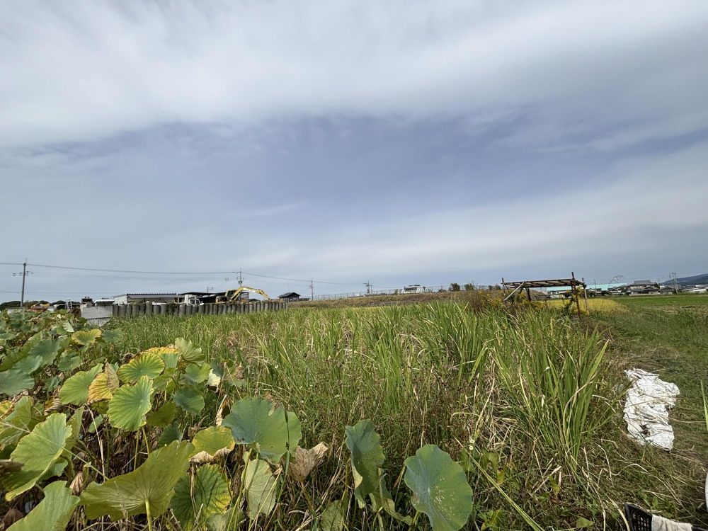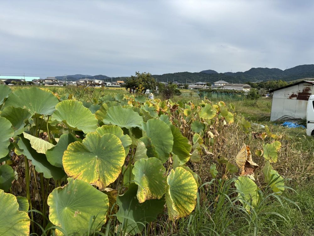 野間さんによれば、今の畑は手前でその蓮根畑をしていたイズミさんという方の田んぼだったそうです。田んぼは刈り入れ時になると水を抜きますが、それは常時水が必要なレンコンに影響がでるということで、イズミさんは蓮根に影響のない別のものを植えることになったのです。