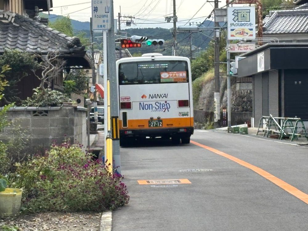 とても気になった私は、野間さんにお話を伺うことにするため、畑に向かいました。マコモのこともですが、ぶどう農園やワインの醸造がどうなっていることも含めてお話を伺いたかったからです。バスで降りたのは河南町の神山バス停ですが、冒頭にも述べたように、野間さんのマコモ畑が河南町の境界線付近にあるからです。