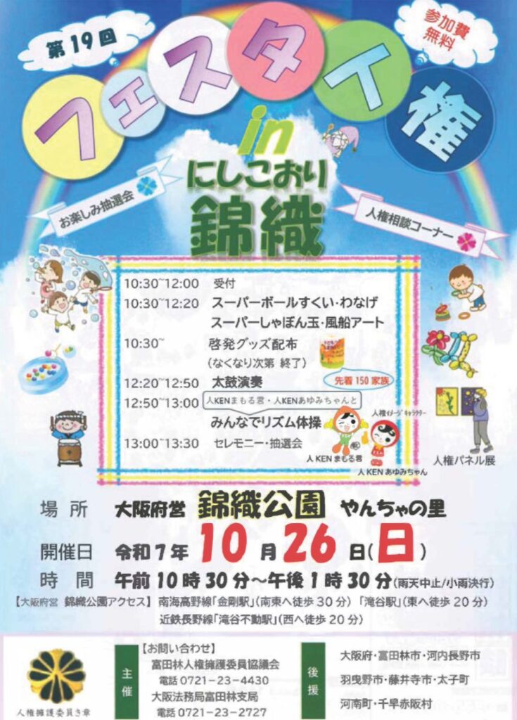 10月26日に錦織公園で19回目となる人権フェスタが開催されます。会場は大阪府営錦織公園のやんちゃの里で10:30〜13:30の間で行われます。雨天の場合は中止ですが、小雨なら決行の予定です。