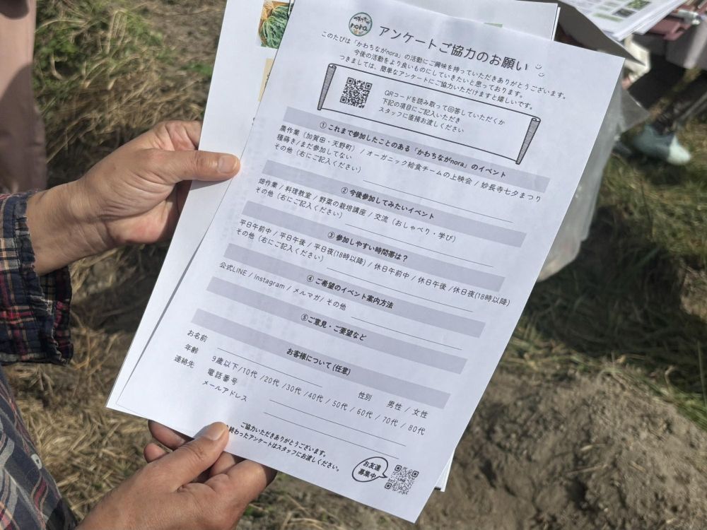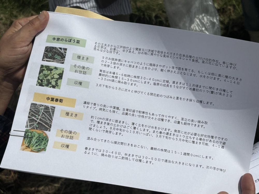 さらに種まきから収穫までのアドバイスが開かれた紙付きです。つまり種まきのイベントをきっかけに家庭菜園にチャレンジしてほしいという思いと、できれば農薬などに頼らない自然の方法で作ることで、かわちながnoraやオーガニック給食チームの活動に対する理解を深めてほしいというわけですね。