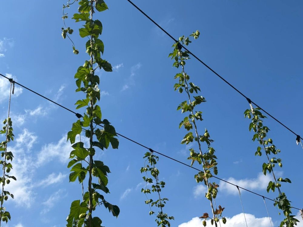 夏になって収穫前に畑に行くと驚きました。本当にロープを伝ってホップの弦が天井付近にまで伸びていました。