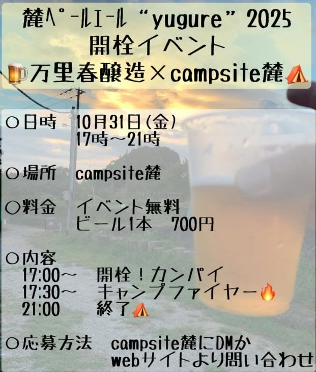 料金 イベントは無料。宿泊される方は宿泊料金が必要、開栓するビール “yugure”2025缶は、1缶700円で販売(持ち帰り不可、現地で飲む分のみ)、ビール以外の食べ物や飲み物は無いので持参してほしいとのこと。