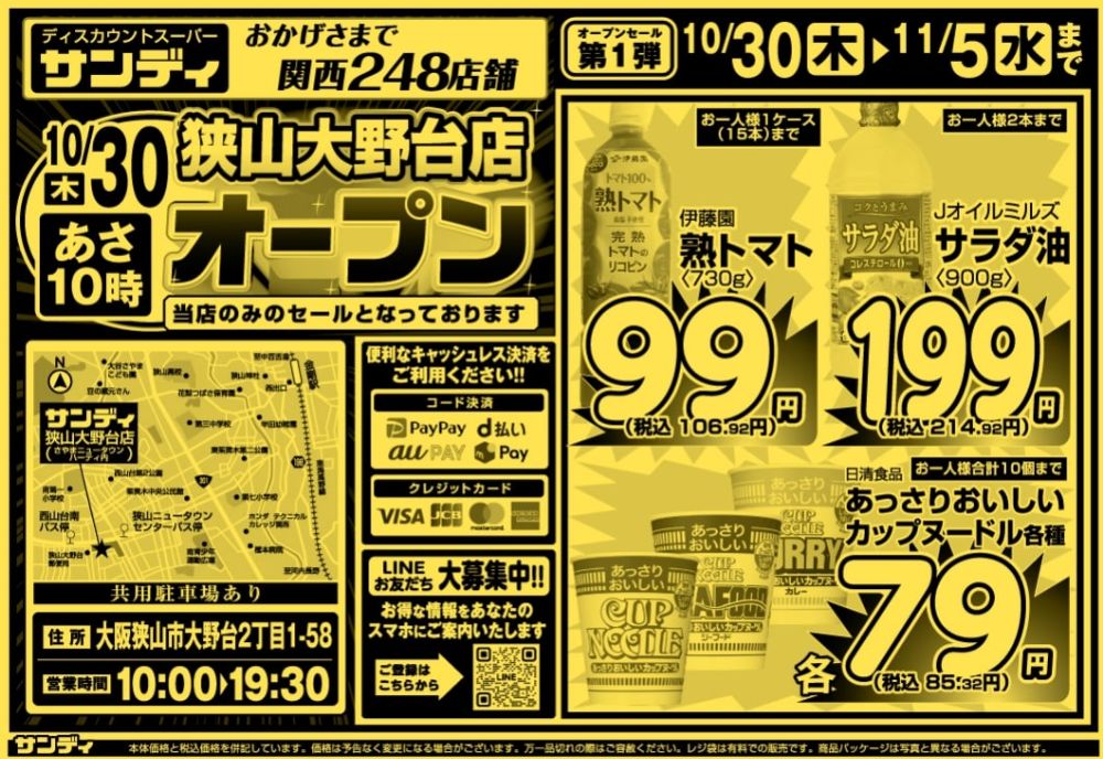 【大阪狭山市】いよいよ明日10月30日10時から、サンディ大野台店がオープンします(オリジナル)