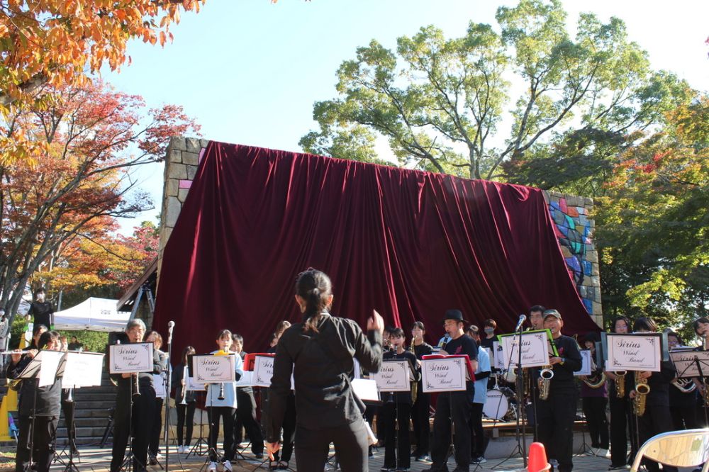 壁の目の前では、シリウスウインドバンドによる演奏が行われ、壁にはワインレッド色した幕がかけられております。予想以上に大がかりな除幕式が行われていたようですね。