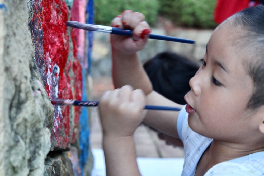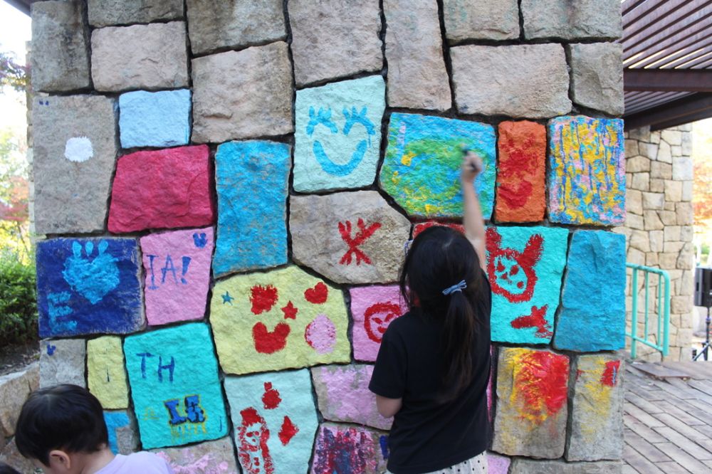 特に大きな決まりもなく、壁に自由に描いていく様子。印象としてピュアな気持ちを持っている子供たちの方が自由に創作できると思えるので、凄いものができる可能性が高いかも。