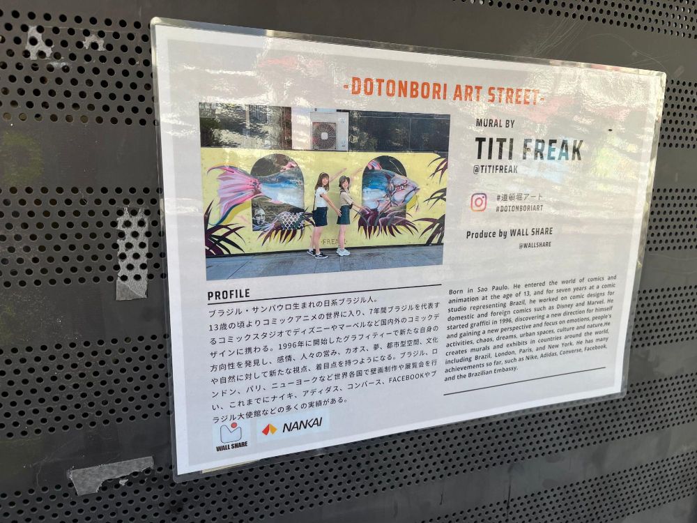 ちなみに本当に偶然ですが、先日道頓堀に行く機会があったときに、TITI FREAK氏の作品を道頓堀川の壁面で見つけました。