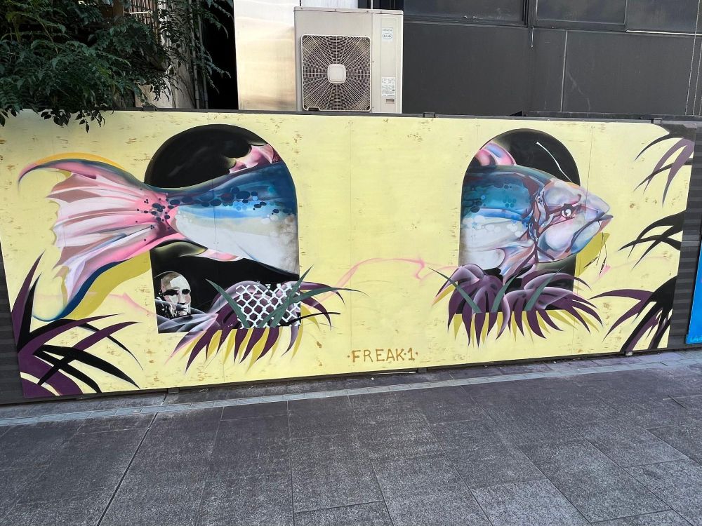 こちらがDOTONBORI ART STREETにあるTITI FREAK氏の作品です。2次元の壁のはずなのに、まるで穴の中に魚が入り込んでいて、立体的に感じますね。