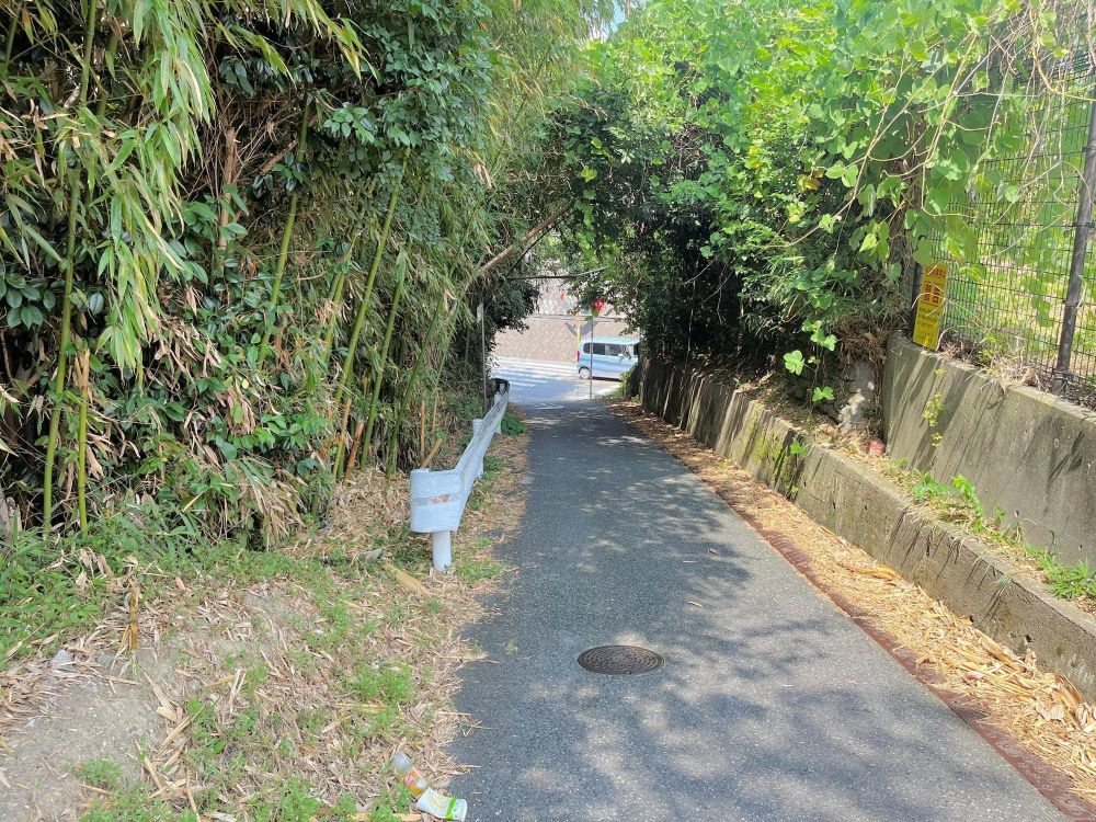しばらく歩くと、美加の台方面に上がる道があります。画像正面の黒くなっている部分に道があります。