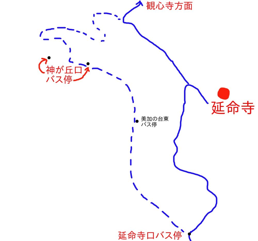 ただこの道は足場があまりよくないためか、延命寺に行く際に、延命寺口バス停よりも神が丘口バス停から舗装された道を歩くことを奨励されているようです。ガイドブックなどの案内を見ても、神が丘口バス停下車と書いている場合が多いです。なので、当日は上の画像の点線のルートが勧められているかもしれません。