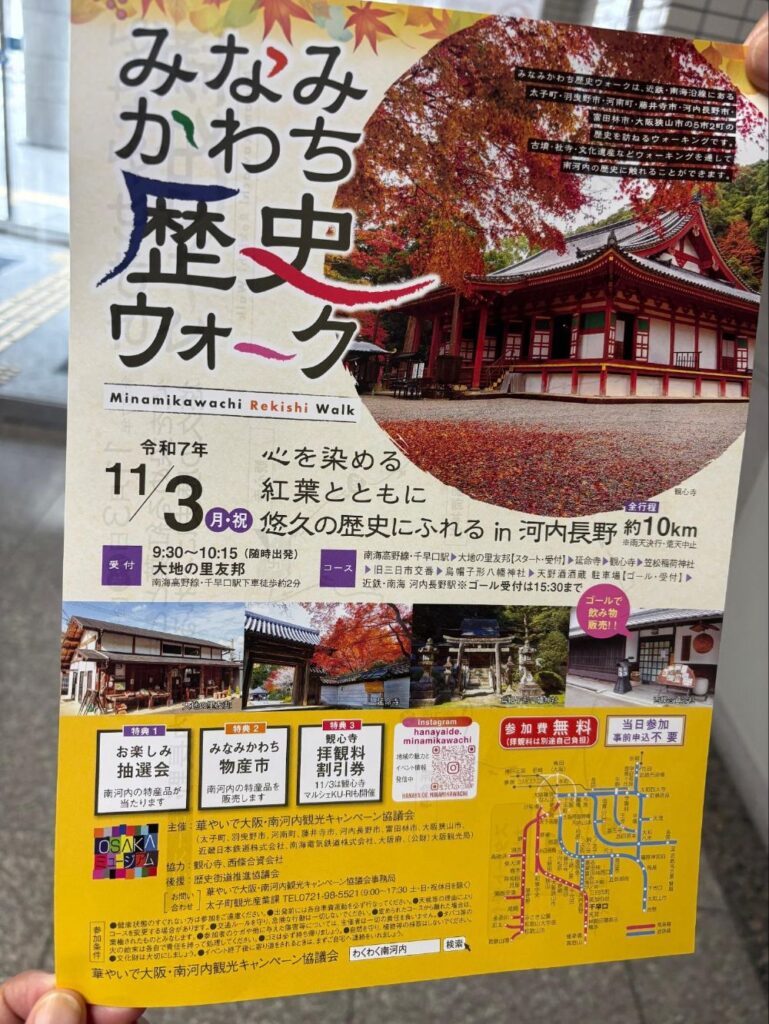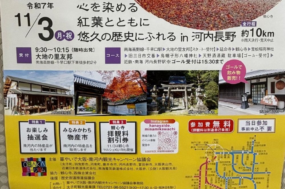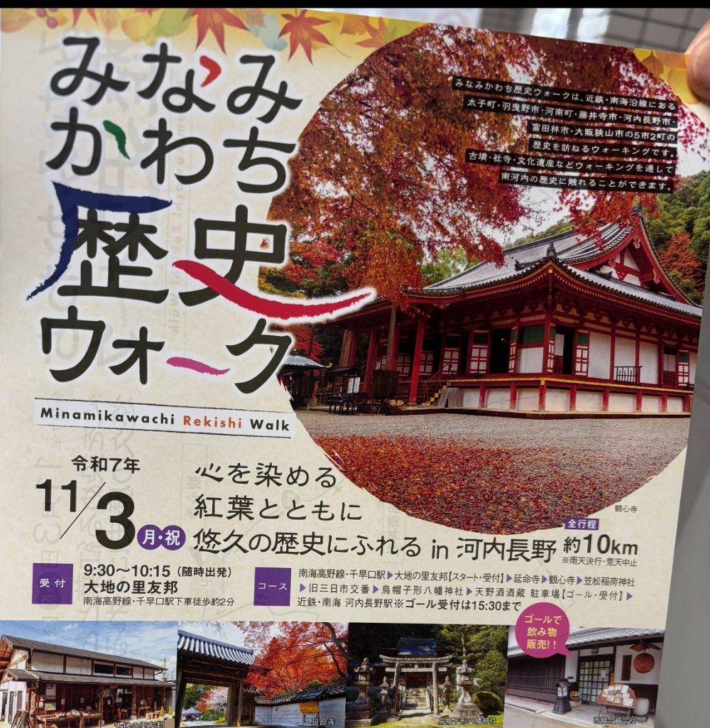 ということでざっくりではありますが、11月3日のみなみかわち歴史ウォークのコースには何があるのか紹介しました。当日参加の参考になれば幸いです。なお、観心寺の割引券のほか、お楽しみ抽選会やみなみかわち物産市なども行われるそうです。