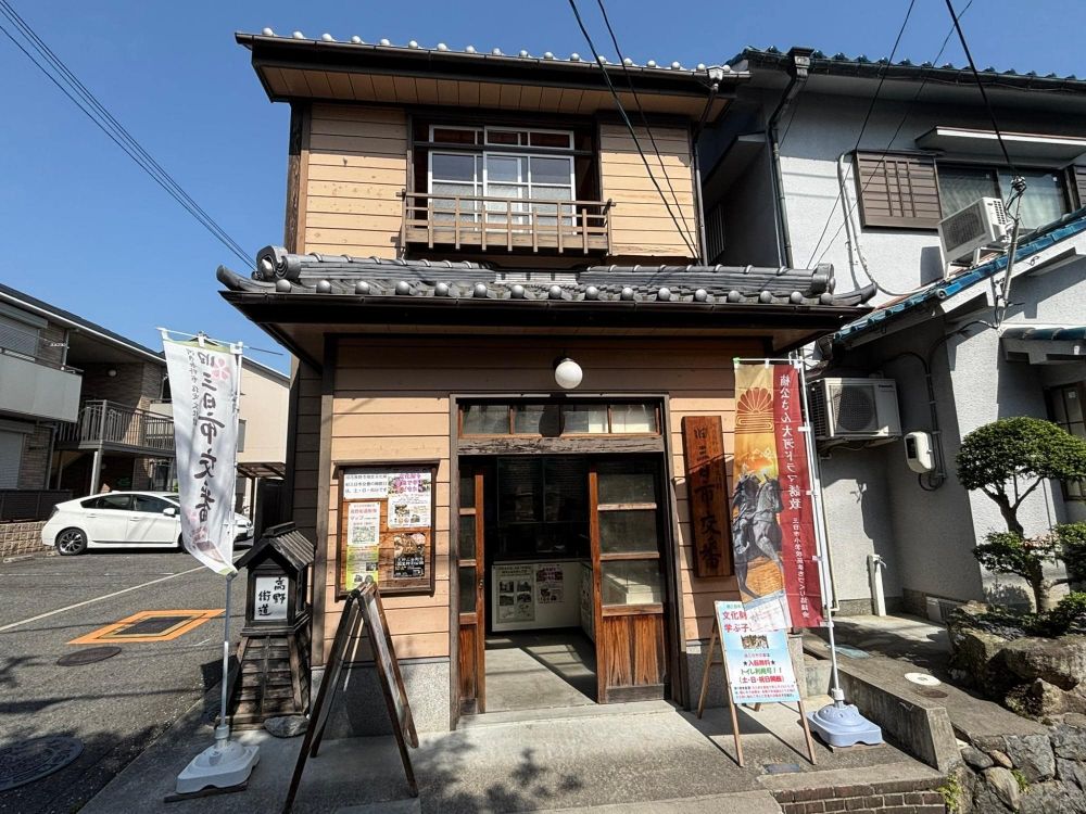左手に幕末の天誅組も立ち寄ったとされる油屋旅館の跡地の記念碑があり、その先に天見川に架かる橋を渡れば旧三日市町交番はすぐそこです。