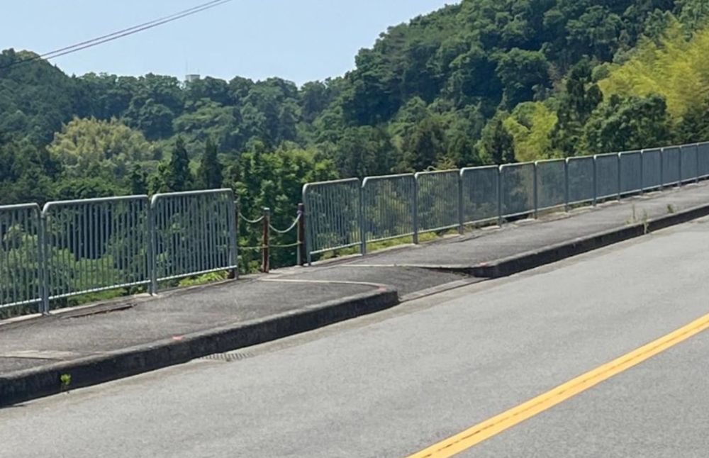 峠を越えると下りが少しあり、やがてピンク色の橋が見えてきます。これを渡ると観心寺はすぐ目の前です。