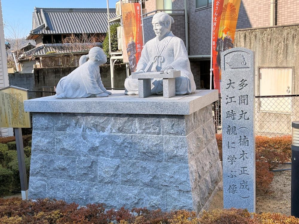 三日市町駅の周辺には楠公こと楠木正成由来のものが多くあります。こちらは三日市町の駅前にある石像で、高野街道の入り口の隣にあります。