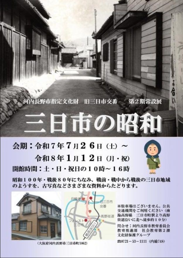旧三日市交番は土日祝日に開いているので、11月3日も公開中です。ちょうど「三日市の昭和」という常設展が行われています。無料で10分程度で見学できるので、ウォーキングの休憩を兼ねて見学してみてはいかがでしょう。