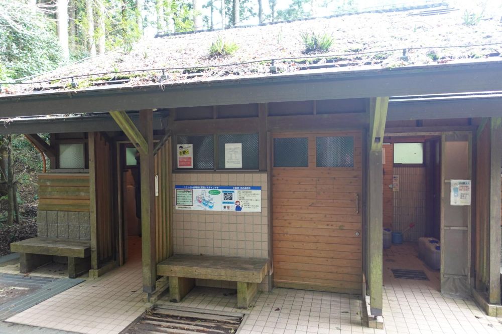 緑の森に入るとすぐのところにあるトイレ、岩湧山の山頂付近にある唯一のトイレです。登山は長丁場ですから、できるだけ立ち寄って用を済ませましょう。