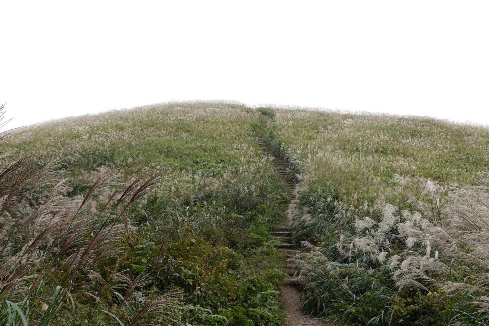 一面ススキに覆われた山の真ん中の階段を登っていきます。この上はもっとススキが覆っていて、背の高さくらいまでありました。