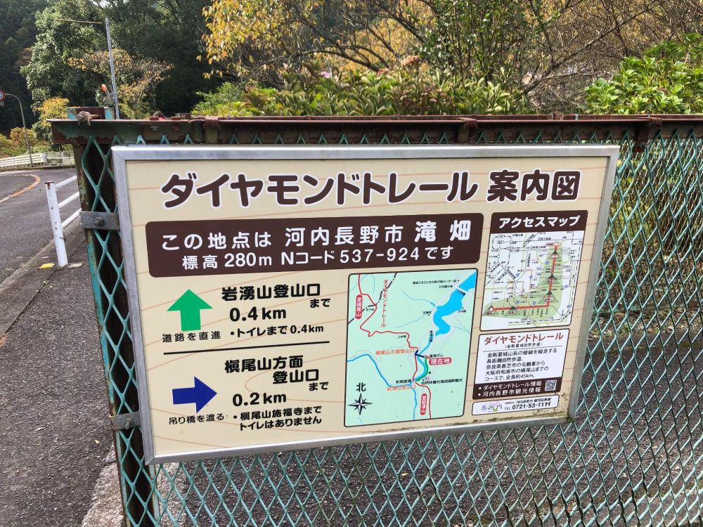 滝畑ダムと登山口の間にある看板です。あと400メートル先にあるとのことですが、ここではその上にある「ダイヤモンドトレール(通称:ダイトレ)」について確認しましょう。