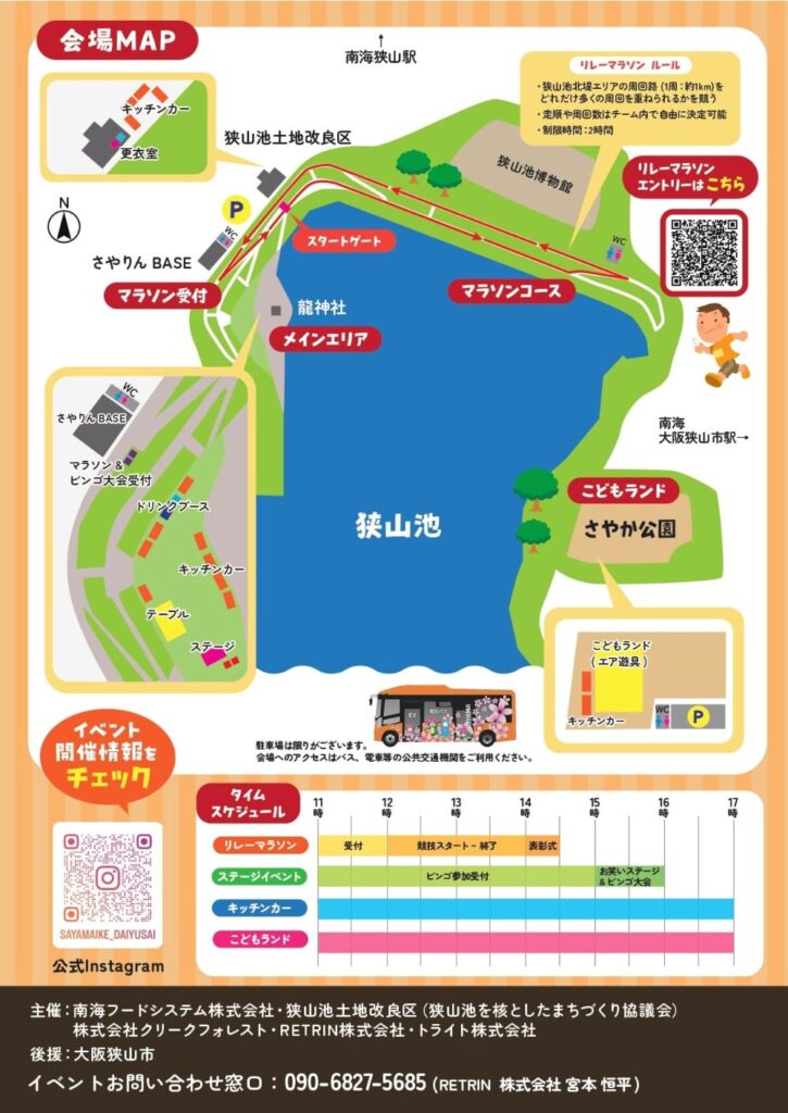 リレーマラソンは事前登録制ですが、そのほかのイベントは当日参加できます。ステージでは15時から16時まで3組のお笑い芸人のステージライブ、ビンゴ大会があります。またステージの横にキッチンカーも出ます。さらにさやか公園では子どもランドということで、キッチンカーとエア遊具を設置するとのこと。なお、駐車場には限りがあるため、電車やバスなど公共交通機関を利用しましょう。