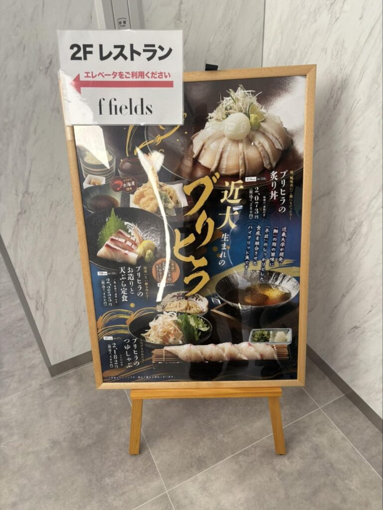 レストランでは近大生まれのブリヒラ(ブリとヒラマサ交配させてたもの)が食べられます。これはブリのうまみとヒラマサの歯ごたえと美味しさを兼ねそろえた魚で、近大が初めて作出に成功した(外部リンク)そうです。