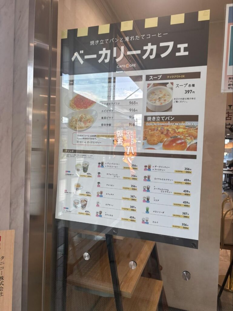 スープは397円で、店内の工房で焼き立てのパンもあります。フードメニューに204円(テイクアウトは200円)をプラスするとコーヒーかダージリンティーがつくとのこと。同様にドリンクはテイクアウトの場合は少し安くなります。