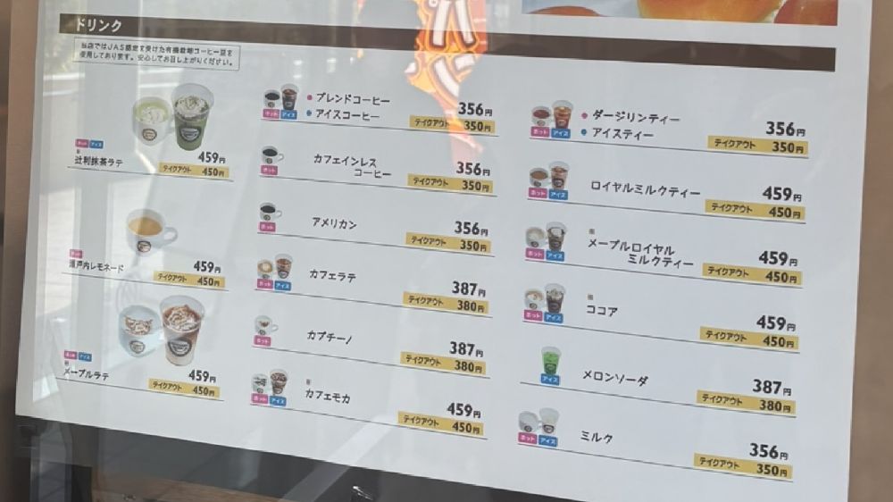 ドリンクメニューです。JAS認定を受けた有機栽培コーヒー豆を使用しているとのこと。瀬戸内レモネード、カフェインレスコーヒー、アメリカン、カプチーノはホットのみ、メロンソーダーはアイスのみですが、あとはホットとアイス両方から選べます。