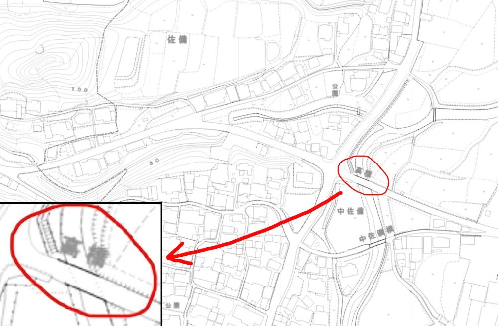 これがこちらです。これは地形図ですが、中佐備の近く、佐備川にかかる橋の名前も高橋なのです。