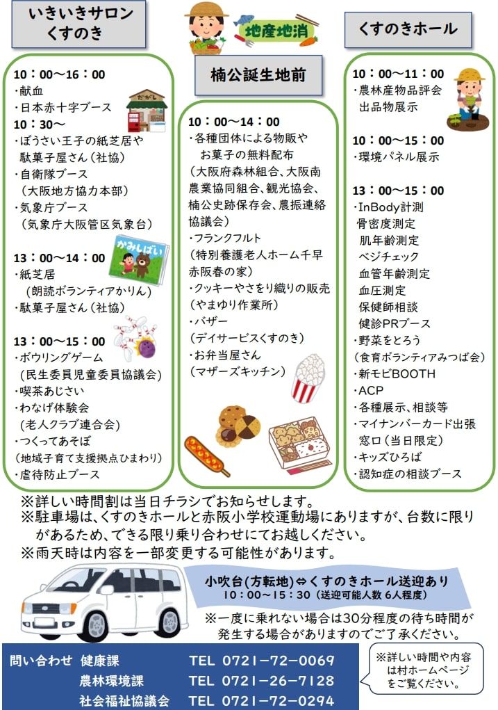 当日の駐車場はくすのきホールと赤阪小学校運動場を用意しますが、台数に限りがあるためなるべく乗り合わせできてほしいとのこと。また小吹台(方転地)と楠温気ホールの間で10:00~15:30の間に送迎を行います。なお送迎可能人数は6人程度なので、1度に乗れない場合は30分の待ち時間が発生する場合があります。